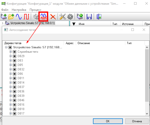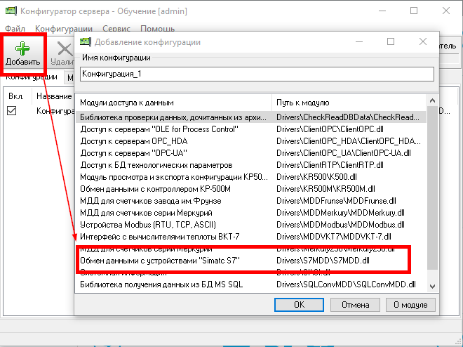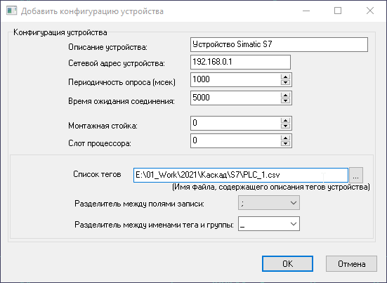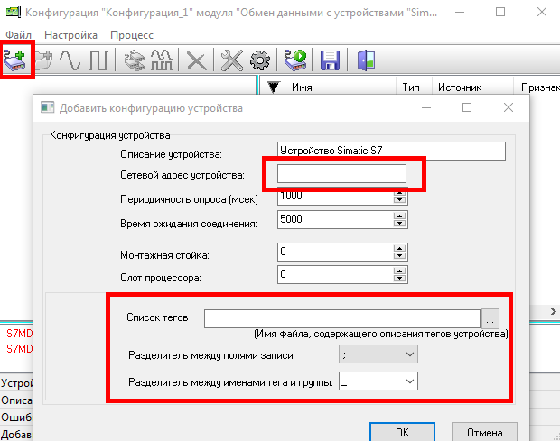 Заходим в конфигурацию, выбираем «добавить устройство», вводим необходимые параметры: сетевой адрес, описание. Каждое устройство – это физический контроллер Siemens.