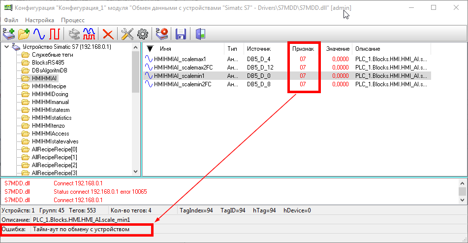 и проверяем получение данных по тегам. Если теги синие и качество тега 00, значит, данные корректные, если что-то не так, то будет выдан код ошибки, при наведении на нее увидите расшифровку: